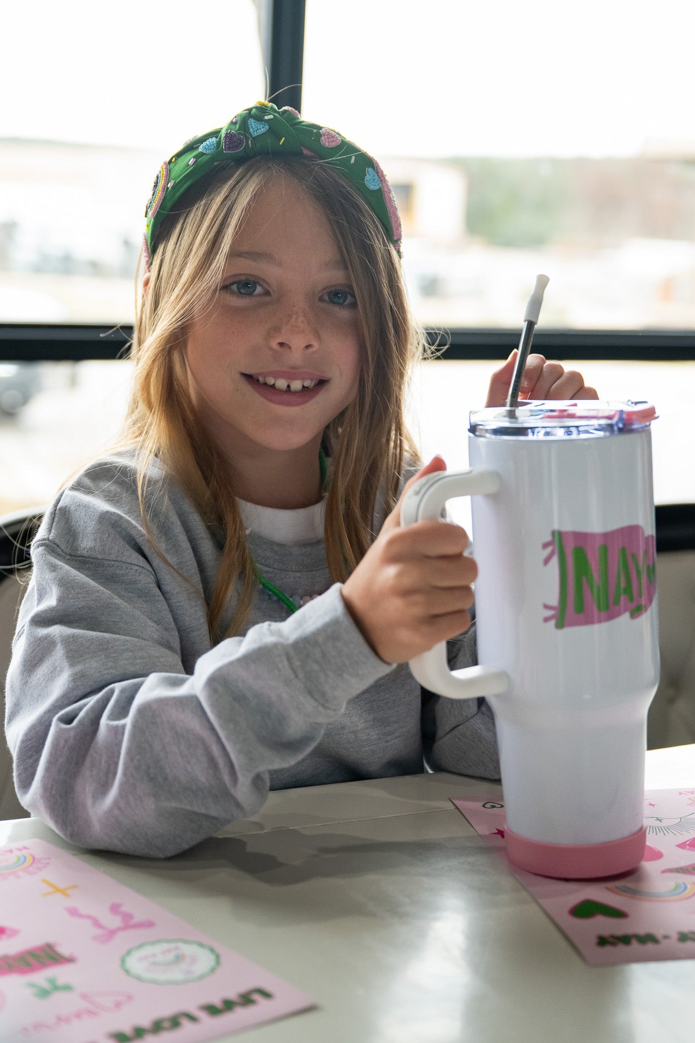 A cup you’ll reach for daily—this 40oz tumbler keeps drinks cold, includes a straw lid and handle, and features bright Live & Love Like NayNay designs.