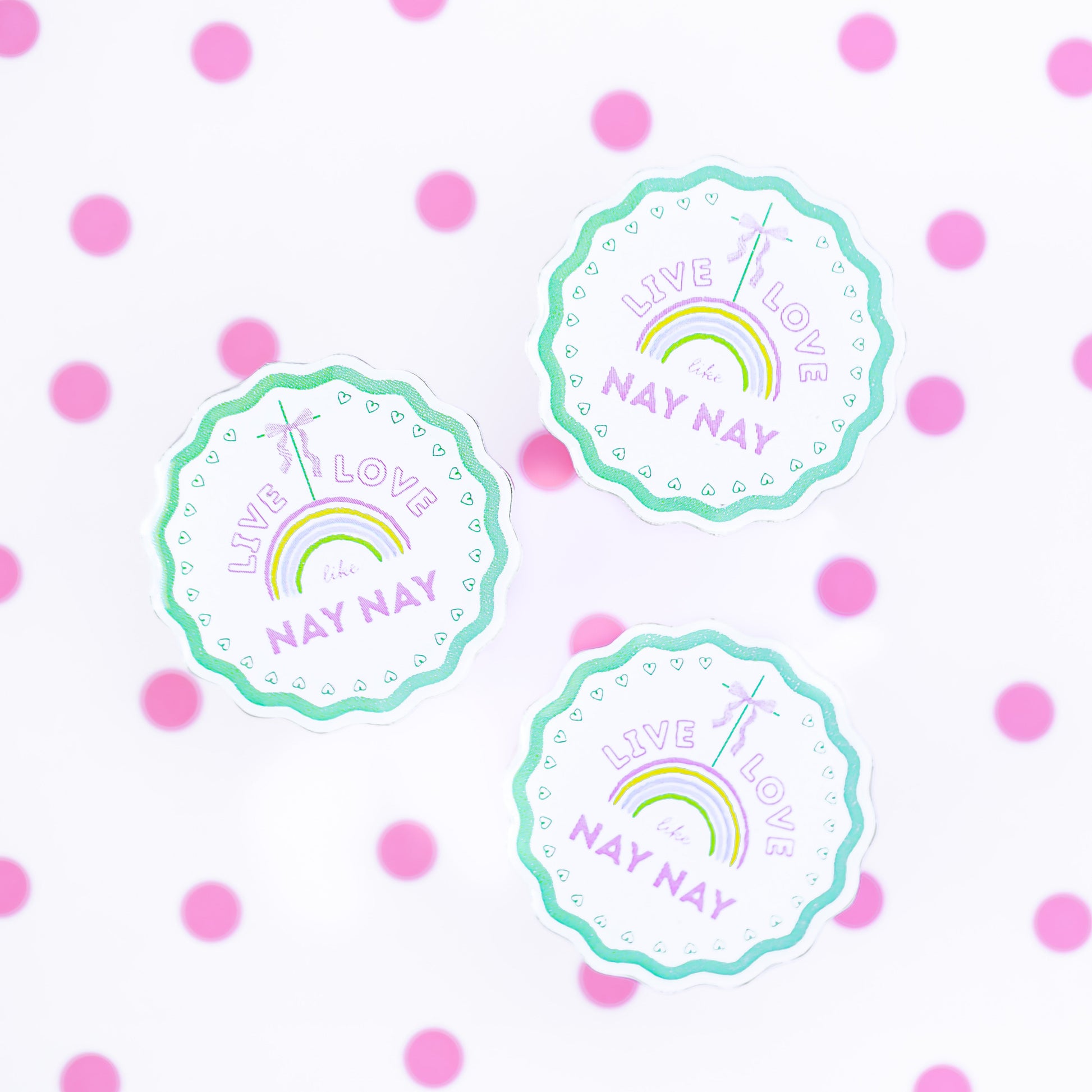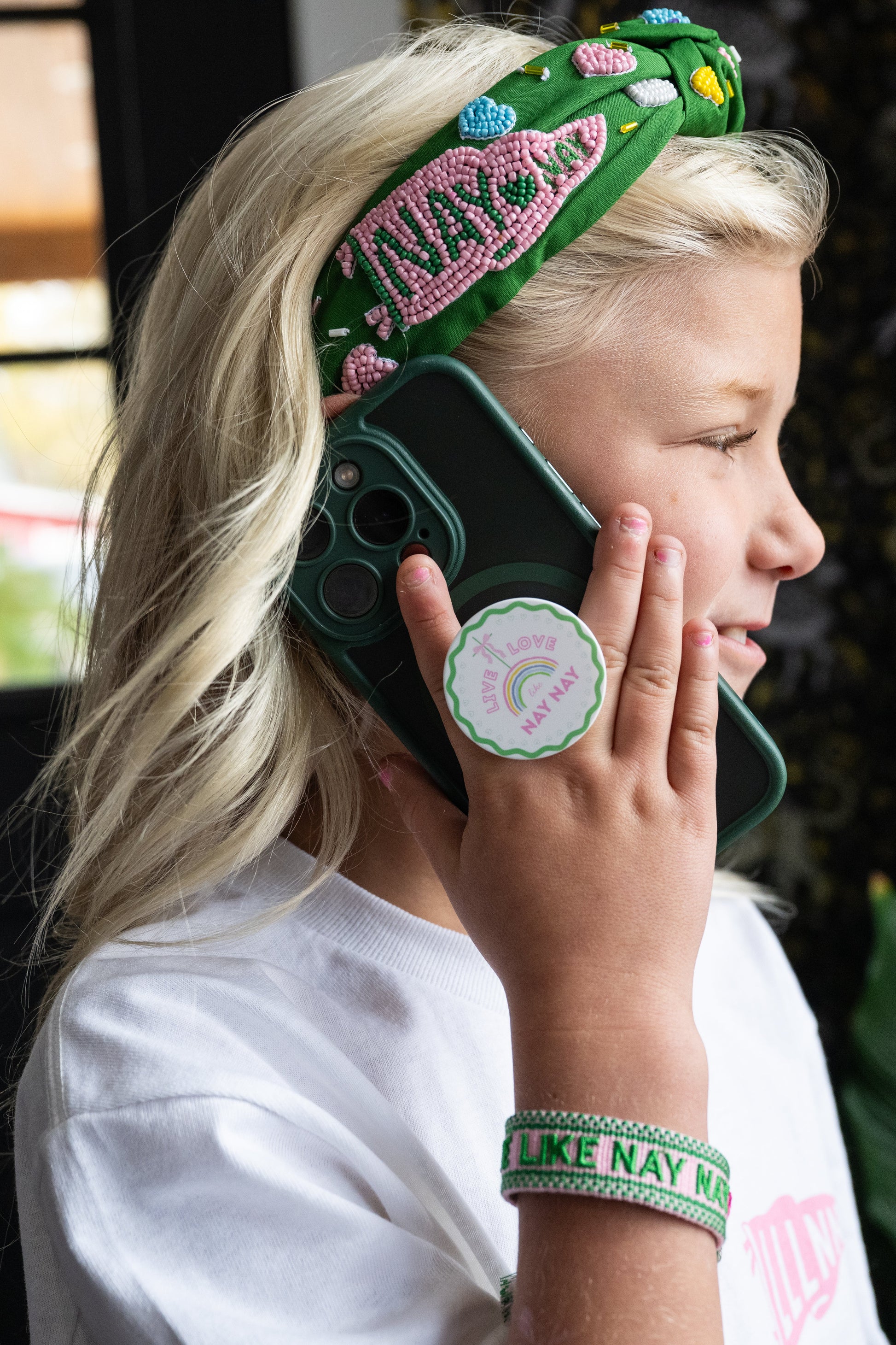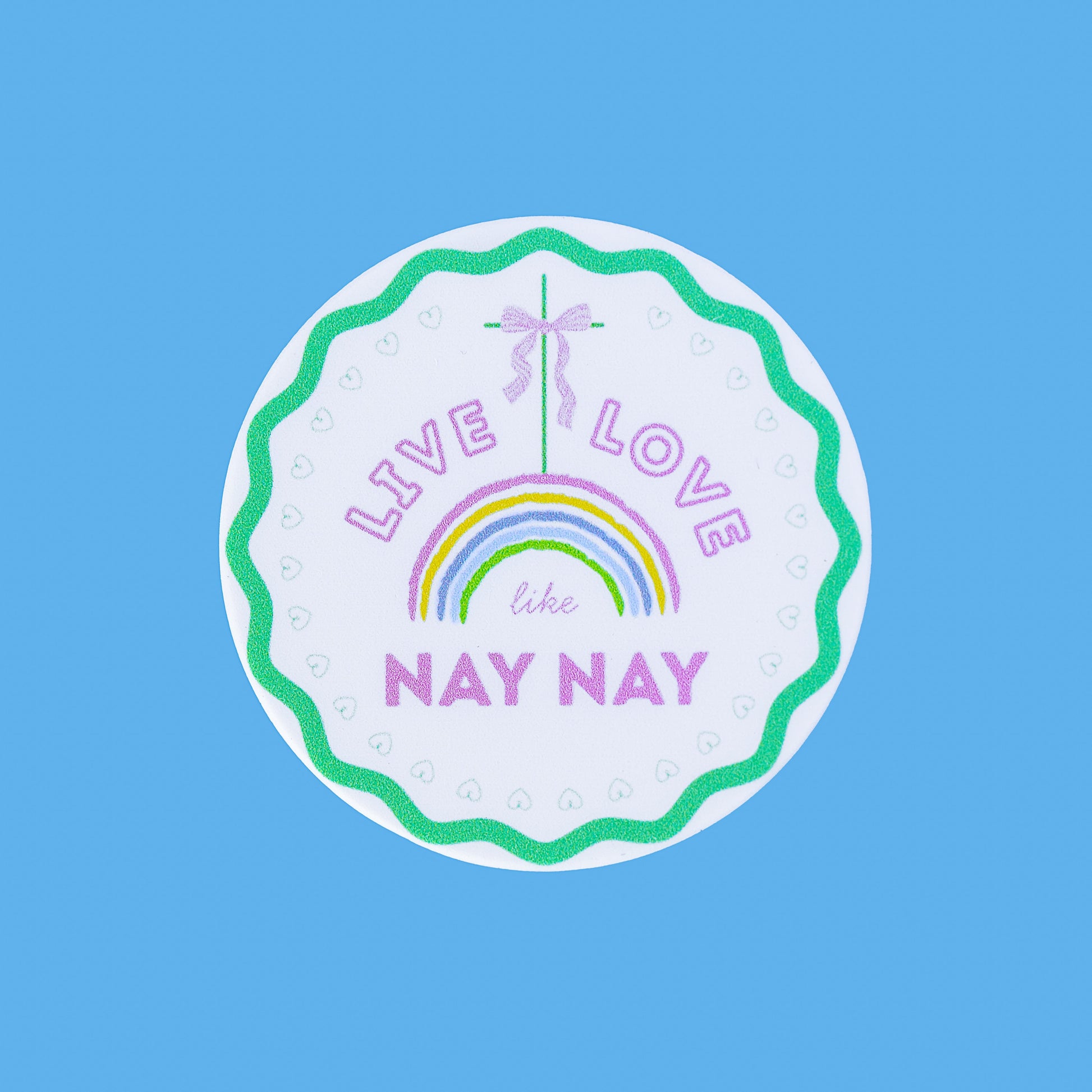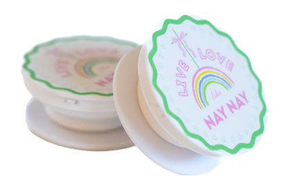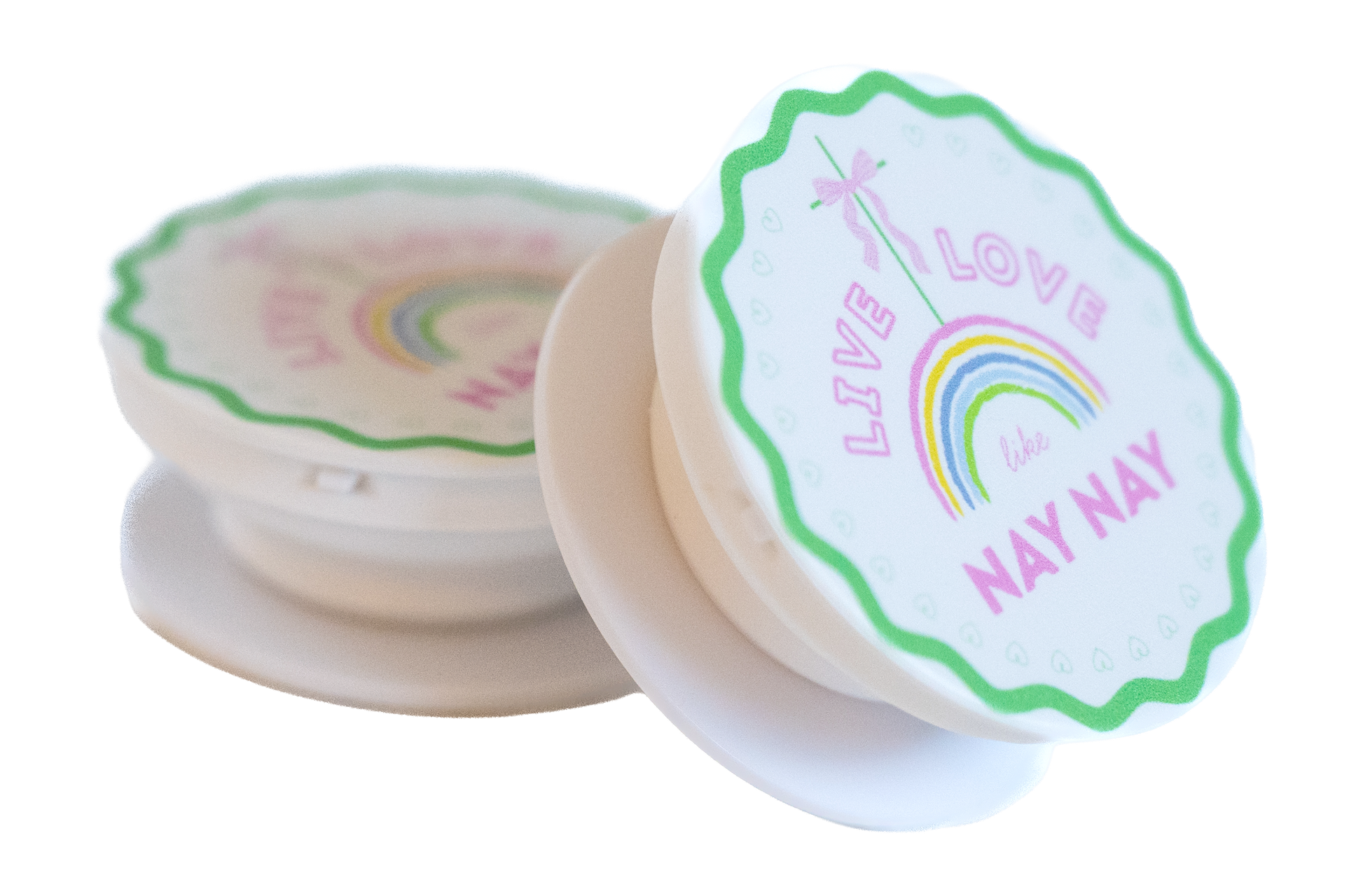 A full-color phone grip featuring the “Live & Love Like NayNay” logo. With a strong 3M adhesive backing, it’s a functional and stylish addition to your phone or case.