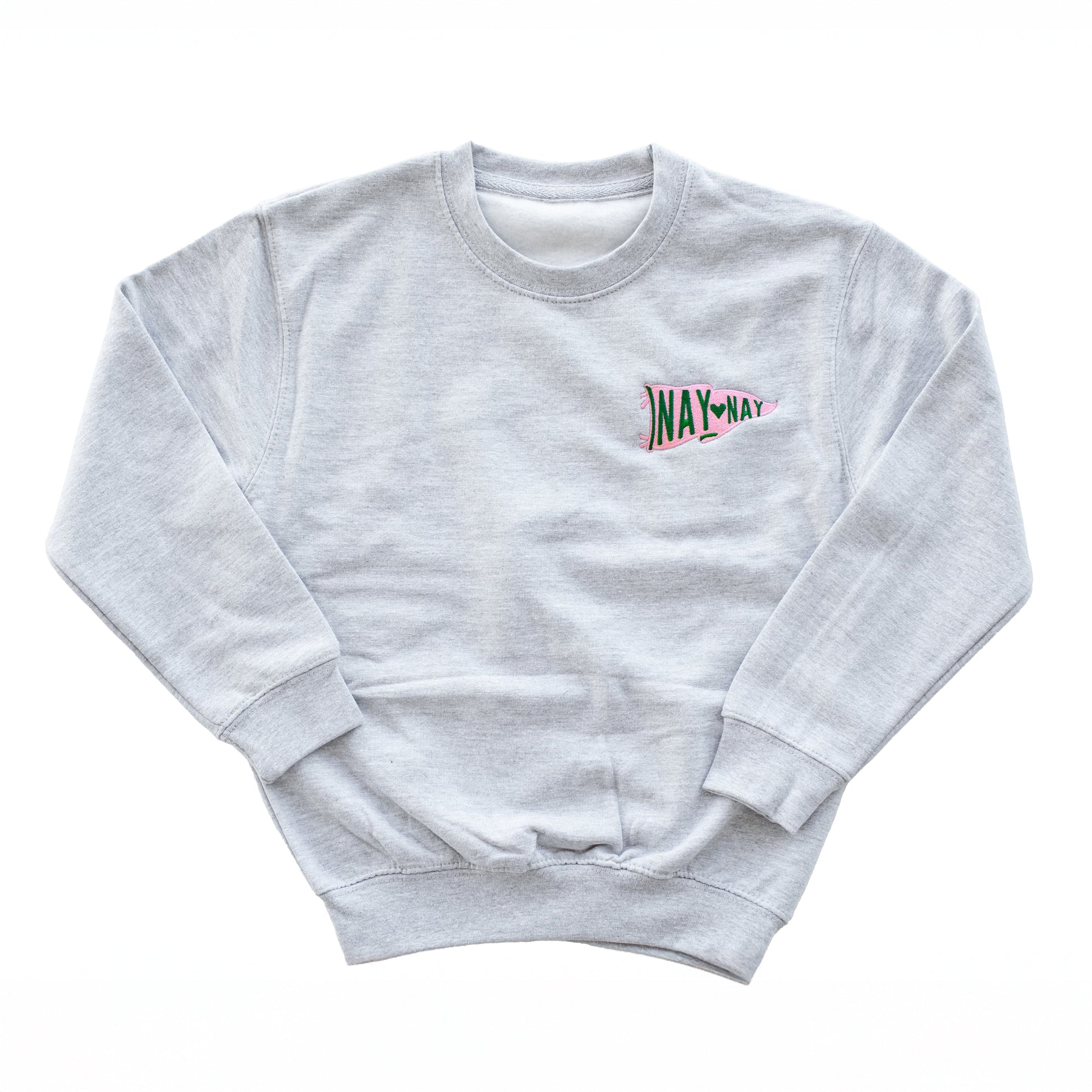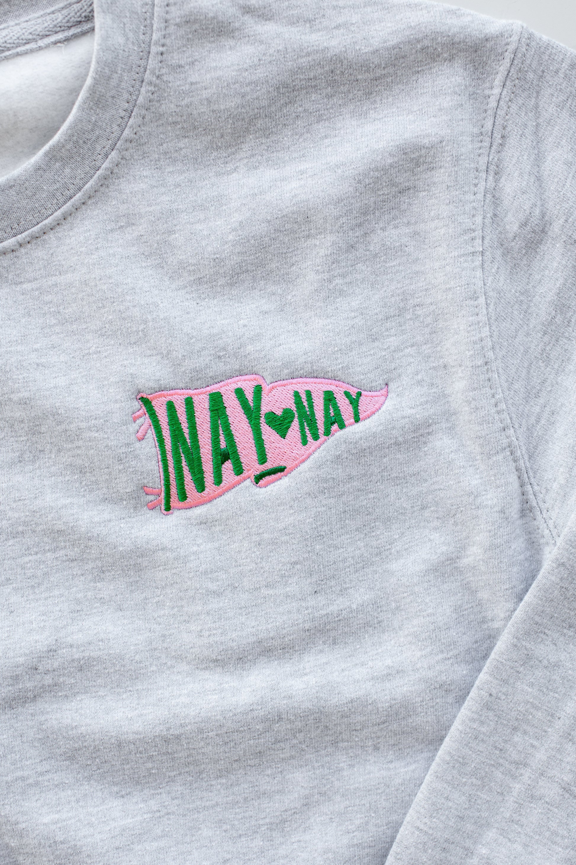 A soft crewneck sweatshirt featuring the embroidered NayNay pennant on the front left chest. Available in heather gray and cornflower blue, it’s an easy, everyday layer with a clean and classic look.